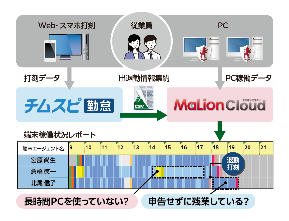 今回の連携によって、「チームスピリット」に蓄積する勤怠データ(出勤時間、退勤時間)と「MaLionCloud」のPC稼働ログデータを突き合わせて、労働時間の乖離把握ができるようになりました。勤怠管理とPC稼働ログデータ管理ツールが連携したことで、双方のサービスを利用しているユーザーは、「PCの画面がアクティブかどうか」の確認も可能となり、出退勤前後の「サービス残業」を発見し過重労働を防止することができます。