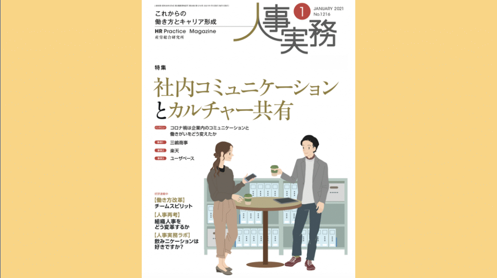 2021.01.04 メディア掲載1月1日発売の「人事実務 2021年1月号」にて、弊社の働き方改革の取り組みに関する記事が掲載されました。