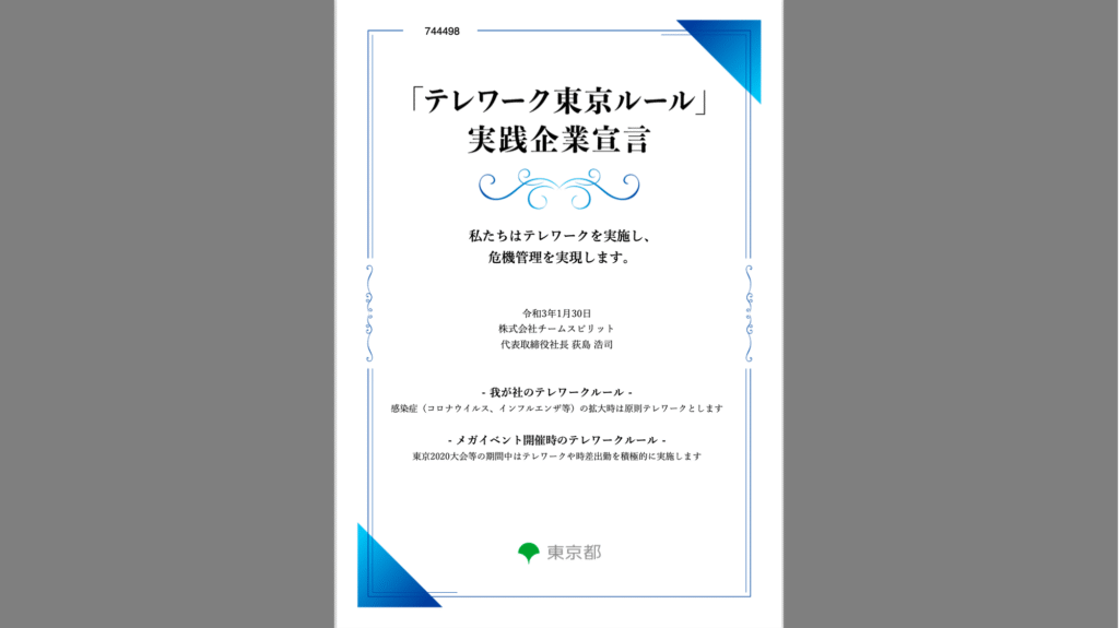 2021.01.30 メディア掲載「テレワーク東京ルール」実践企業宣言企業一覧にチームスピリットが掲載されました。