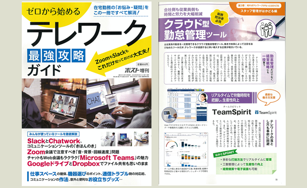 2020.07.01 メディア掲載6月30日発売の週刊ポスト増刊「ゼロから始めるテレワーク最強攻略ガイド」にて、TeamSpiritが紹介されました。