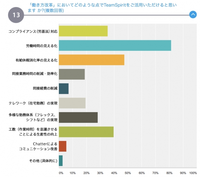TeamSpiritの導入による「働き方改革」の成果として望むことは、「労働時間の見える化(81.3%)」が一番に挙げられました。これは、「働き方改革」として最初に着手することとも合致しており、お客様にとってもTeamSpiritは「『働き方改革』のプラットフォーム」である、と認知していただいているものだと考えます。