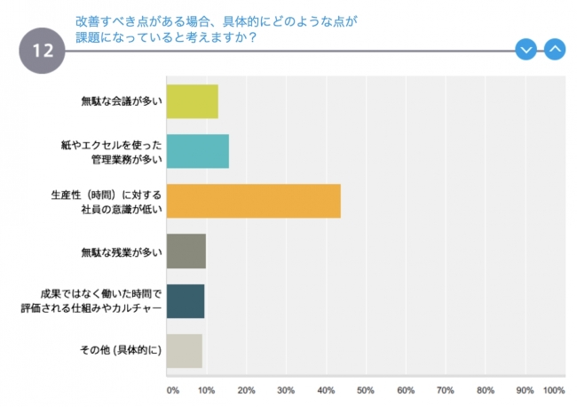 長時間労働の是正によって労働環境が整えられたのち企業が成長していくためには「生産性の向上」を目指す必要があります。これを実現させるための課題としては、「生産性(時間)に対する社員の意識が低い(43.6%)」が最も多く挙げられており、今後「時間に対する意識改革」が重要視されるものだと推察されます。
