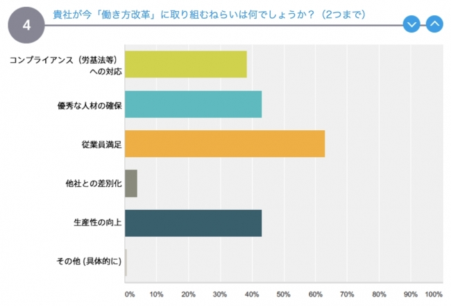 「働き方改革」への取り組みは「様子を見ながら徐々に取り組んでいる(41.1%)」が最も多く、その取り組みの内容は、「長時間労働の是正(79.7%)」が突出しています。また、各社この取り組みを通して、「従業員満足(62.8%)」「優秀な人材の確保(43.0%)」「生産性の向上(43.0%)」を目指しているとの結果が多く示されました。