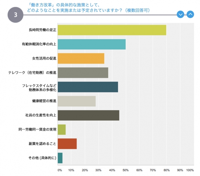 他方、現場の意見として「長時間労働が続くことで(アウトプットの)品質が落ち、結果として売り上げや成果に悪影響が及ぶ」という生産性の低下とその悪循環を懸念する声も見られました。この意見からは、「長い時間をかけてでも仕事をすること」を是とする考え方が染み付いていた日本の労働環境に、「当たり前でありながら”新しい”考え方」が広がってきたことを感じさせます。