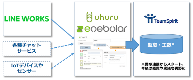 株式会社チームスピリット(本社:東京都中央区、代表取締役社長:荻島 浩司、以下チームスピリット)と株式会社ウフル(所在地:東京都港区、代表取締役社長CEO:園田崇、以下ウフル)は、チャットサービスでの”つぶやき”や、IoTデバイスなどから取得できる”センサーデータ”を、TeamSpiritの勤怠データや工数データとして取込める連携サービス「enebular for TeamSpirit」の提供を本日開始しました。