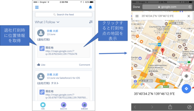 TeamSpiritのWebタイムレコーダやモバイルアプリTeamSpirit1で勤怠打刻する場合、GPS機能等によって打刻した位置情報を取得し、標準のチャットツールChatterを通じて、上司や人事担当などに位置情報をメッセージとして送ることができるようになりました(図参照)。これにより、上司や人事担当は、部下や社員がテレワークをしたり、取引先に直行(また直帰)したりする場合、所定の場所で業務を開始・終了したかをリアルタイムで確認することが可能になります。
