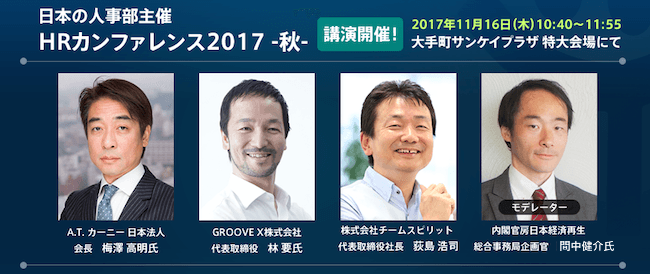 株式会社チームスピリット(本社:東京都中央区、代表取締役社長:荻島 浩司、以下チームスピリット)は、2017年11月14日〜17日に開催される、日本最大のHRイベントである『日本の人事部』主催の「HRカンファレンス2017-秋-【東京】」にプレミアムスポンサーとして協賛します。また、11月16日(木)には、特大会場にて「働き方改革プラットフォームの挑戦~人生三毛作時代の働き方と新たな人事部の地平~」と題した講演を行います。本講演では、弊社代表取締役社長の荻島と共に、A.T.カーニー日本法人会長の梅澤高明氏と、ソフトバンクで「Pepper」の開発を担当し、現在ロボットベンチャーGROOVE Xを経営する林要氏が登壇し、”人生三毛作”が必要とされる時代の働き方の展望と、企業の人事部の新たな役割などについて議論します。