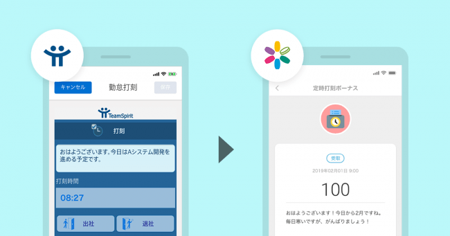 今回の連携により、社員が「TeamSpirit」から出退勤打刻を行うと、出退勤の時刻に合わせて「コミュニティオ」上で自動的に社内仮想通貨が付与されるようになります。