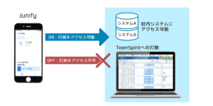 今回の連携では、Junifyでの「ON/OFF」を「TeamSpirit」の勤怠打刻と連携することにより、勤務時間中以外は社内システムにログインができなくなります。これにより、セキュリティが強化されるだけでなく、正確な勤怠情報の取得ができ、隠れ残業の防止にも繋げられます。また、「テレワーク時に社員がどこで作業しているかわからない」という不安も、位置情報の取得によって軽減することができるほか、ジオフェンス機能によりシステムが利用できる場所を限定することも可能です。