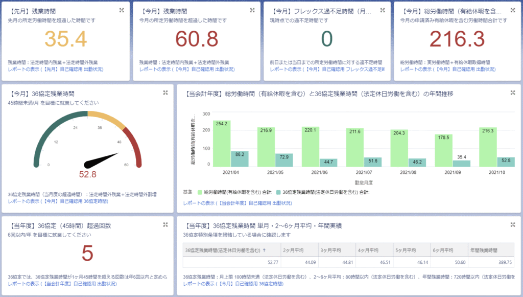 従業員が自分自身の勤怠状況を日々把握することを想定したダッシュボードです。システム管理者がインストールすることで従業員の利用が可能になります。