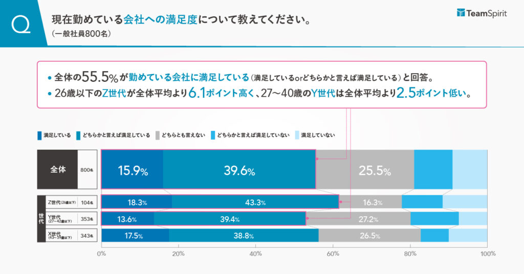 ①【現在勤めている会社の満足度】半数以上(55.5%)が満足していると回答。26歳以下のZ世代の満足度は全体平均より6.1ポイント高い結果となった