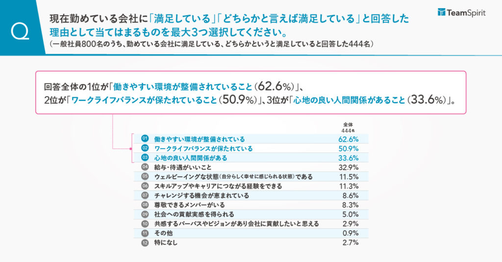 2 | 【会社への満足理由】 1位は「働きやすい環境が整備されていること(62.6%)」、2位が「ワークライフバランスが保たれていること(50.9%)」、3位が「心地の良い人間関係があること(33.6%)」という結果に |
