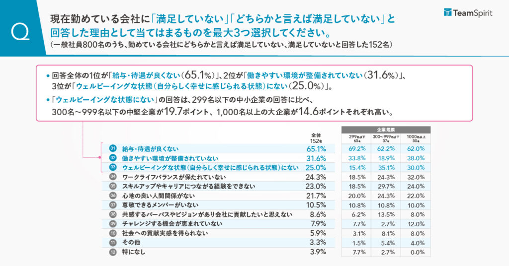 3 | 【会社への不満足理由】 1位は「給与・待遇が良くない(65.1%)」、2位が「働きやすい環境が整備されていない(24.3%)」、3位が「ウェルビーイングな状態にない(25.0%)」という結果に。所属する企業規模が大きいほど、「ウェルビーイングな状態にない」を理由に挙げる傾向 |