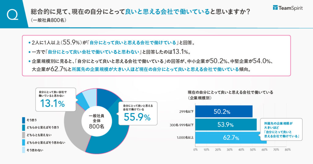 「総合的に見て、現在の自分にとって良いと思える会社で働いているか」について、「そう思う」「どちらかと言えばそう思う」と回答した人は全体の55.9%と、2人に1人以上が自分にとって良いと思える会社で働いている一方、「そう思わない」「どちらかと言えばそう思わない」と回答した人は全体で13.1%という結果に。企業規模別に見ると、「そう思う」「どちらかと言えばそう思う」の回答が、中小企業が50.2%、中堅企業が53.9%、大企業が62.7%と、所属先の企業規模が大きい人ほど、現在の自分にとって良いと思える会社で働いている傾向にあった。