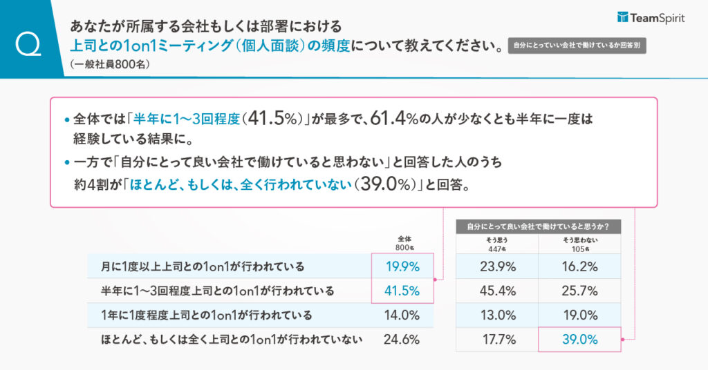 会社もしくは部署における上司との1on1ミーティング(個人面談)の頻度は、「半年に1~3回程」が全体の41.5%と最多で、「月に1回以上」と回答した人(19.9%)と合わせると、少なくとも半年に1回以上1on1ミーティングが実施されている人は全体で61.4%、年1回以上は75.4%という結果に。また、④の「総合的に見て、現在の自分にとって良いと思える会社で働いているか」について、「そう思う」「どちらかと言えばそう思う」と回答した447名(全体の55.9%)のうち約7割(69.3%)が「半年に1~3回程」「月に1回以上」と回答。一方で「そう思わない」「どちらかと言えばそう思わない」と回答した105名(全体の13.1%)のうち約4割(39.0%)が「ほとんど、もしくは全く上司との1on1ミーティングが行われていない」と回答。現在勤めている会社に納得感を持って働いている人ほど、1on1が実施されていることが伺える。