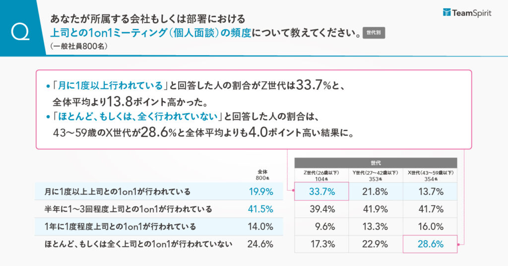 また、世代別に見ると、「月に1回以上行われている」と回答した人の割合は、Z世代が33.7%と全体平均より13.8ポイント高かった。一方で「ほとんど、もしくは、全く行われていない」と回答した人の割合は、X世代が28.6%と全体平均よりも4.0ポイント高い結果に。世代により、1on1ミーティングを受けている頻度に差が出る傾向にあることが分かった。