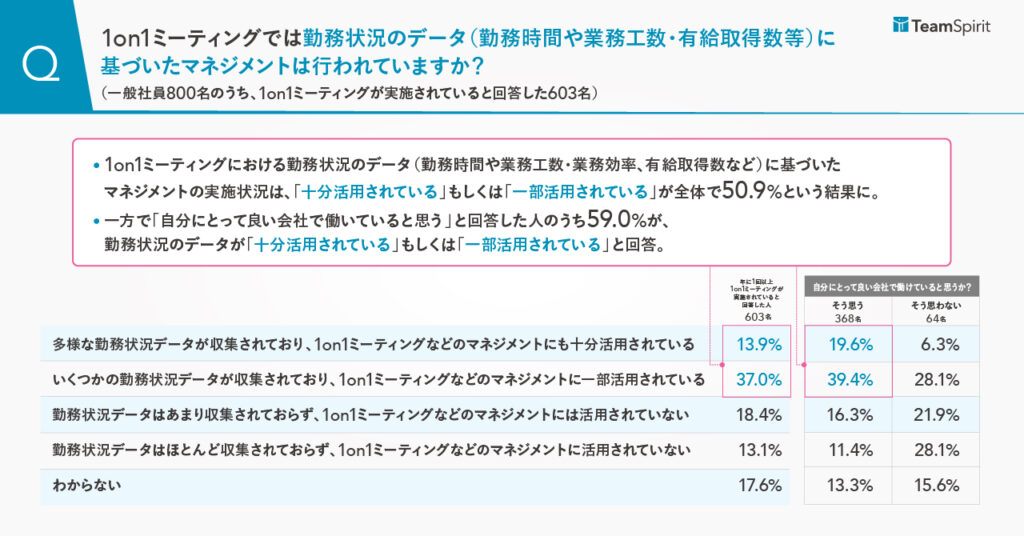 ⑤の「上司との1on1ミーティングの実施頻度」で示した「年に1回以上1on1ミーティングが行われている」603名(全体の75.4%)について、1on1ミーティングにおける勤務状況のデータ(勤務時間や業務工数・業務効率、有給取得数など)に基づいたマネジメントの実施状況は、「十分活用されている」「一部活用されている」が50.9%と、1on1ミーティングが実施されている層の約半数で活用されていることが分かった。④の「総合的に見て、現在の自分にとって良いと思える会社で働いているか」の回答別に見ると、「そう思う」「どちらかと言えばそう思う」と回答した人のうち59.0%が1on1ミーティングで勤務状況のデータが「十分活用されている」もしくは「一部活用されている」という結果に。一方で、「そう思わない」「どちらかと言えばそう思わない」と回答した人のうち50.0%が「活用されていない」と回答。自分にとって良い会社で働いていると思える人ほど、上司による1on1ミーティングが実施されており、また、勤務状況のデータに基づいたマネジメント・対話が行われている傾向にあった。