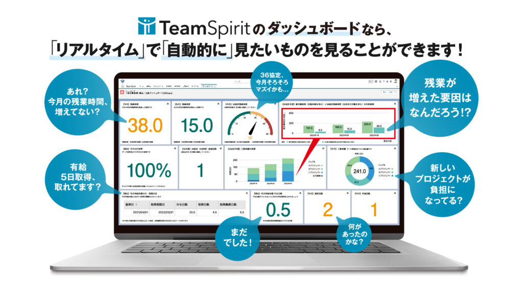 当日ブースにお越しいただいた方に、「TeamSpirit」で表現可能な各種ダッシュボードの実例をご紹介いたします。