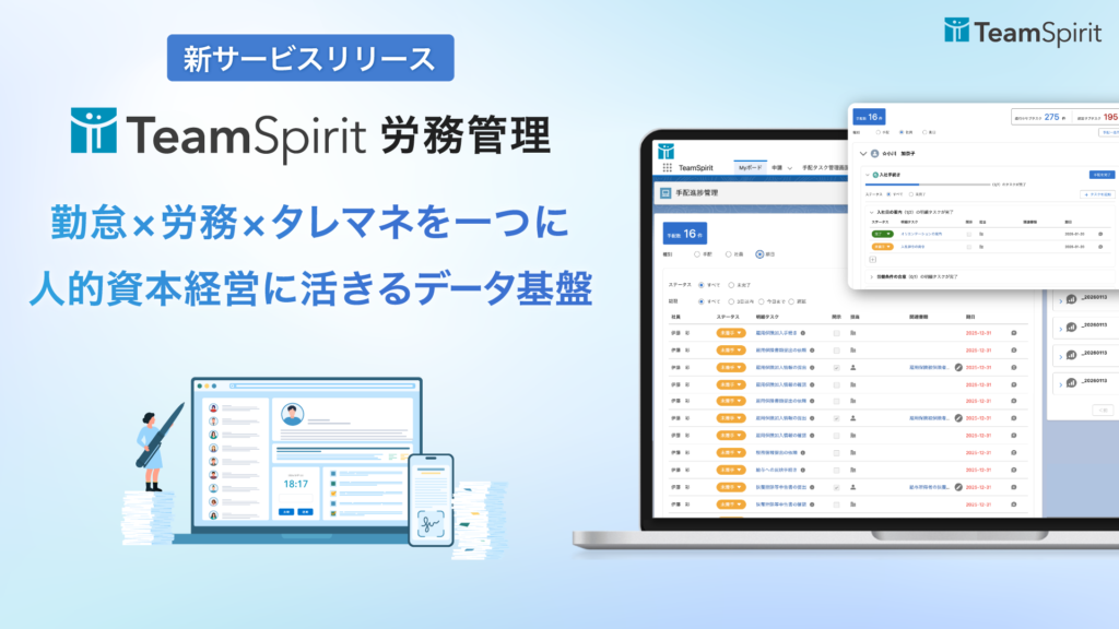 チーム力の最大化の観点から、人的資本の生産性向上を実現する統合型クラウドサービス Team Success Platform「TeamSpirit」を提供する株式会社チームスピリット(本社:東京都千代田区、代表取締役CEO:道下和良、以下チームスピリット)は、「TeamSpirit 労務管理」をリリースしたことをお知らせします。