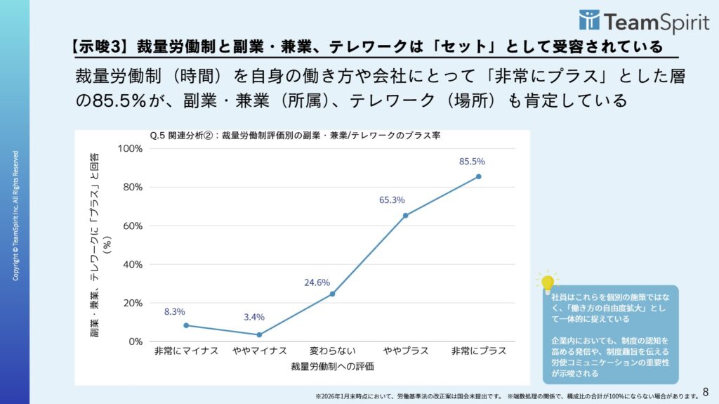 裁量労働制拡大(時間の解放)を肯定する層の85.5%が、副業・兼業(所属の解放)やテレワーク(場所の解放)も肯定しており、これらを個別の施策ではなく「働き方の自由拡大」として一体的に捉えています。