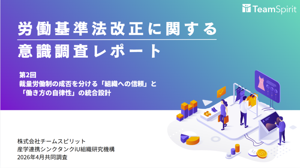 チーム力の最大化の観点から、人的資本の生産性向上を実現する統合型クラウドサービス Team Success Platform「TeamSpirit」を提供する株式会社チームスピリット(本社:東京都千代田区、代表取締役CEO:道下和良、以下チームスピリット)は、産学連携シンクタンクiU組織研究機構(東京都新宿区、代表理事:松井勇策)と共同で、2027年以降の施行に向けて検討されている労働基準法改正に関する意識調査(第2回)を実施しました。