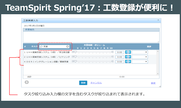 2017.04.06 プレスリリースTeamSpiritメジャーバージョンアップSpring’17リリース 〜更に使いやすくなった工数管理で「働き方改革」を支援 〜